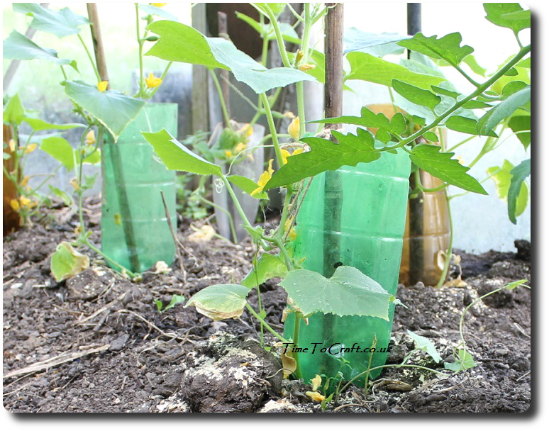 I have a collection of 1 and 2 litre plastic drink bottles, with the bottoms cut off. I’ve collected them over the years. When I plant the tomatoes, cucumbers and peppers in the green house, I sink a bottle, neck first, into the ground beside it. Preferably up hill from the plants. I put a bean pole in the bottle and push it firmly into the ground. The plant is then tied to the pole. Each evening, I use a watering can to fill the bottles a few times.
