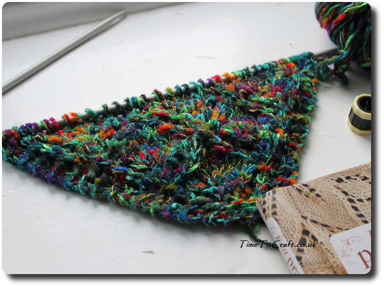 Moving on to my next probably ill-advised stash busting knitting project. I picked up the Sirdar Harlequin yarn at a charity shop, a while back. Only in a charity shop, am I drawn to novelty yarn. Anyway. I’ve started a shawl (ravelry notes). I’m undecided about whether to stick to this pattern, as I keep needing to undo rows. I’ll give it another repeat and see.