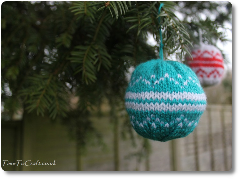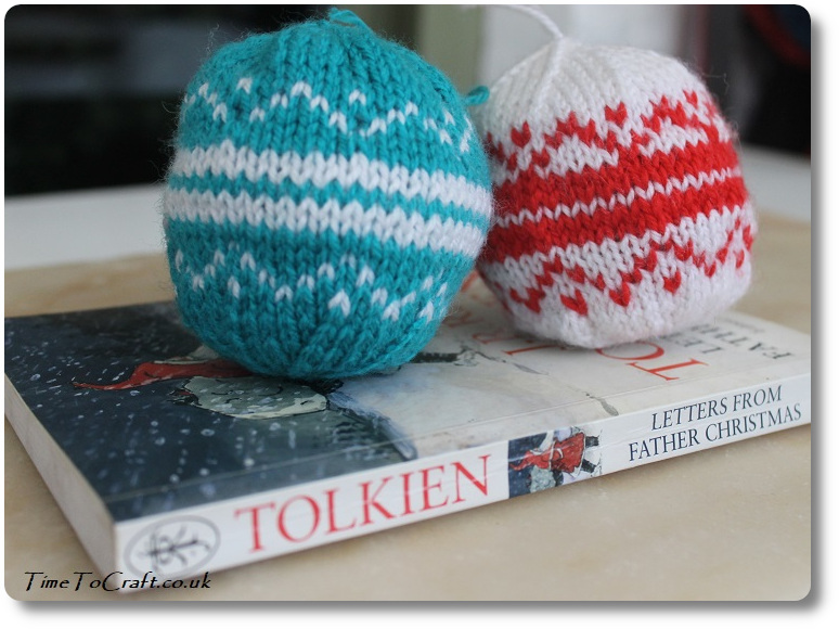 I’ve been working on knitted baubles. Three knitted so far, although one has not made the cut. Less said about that the better! I do like the fair isle pair. They are knitted flat and then the seam is sewn up.