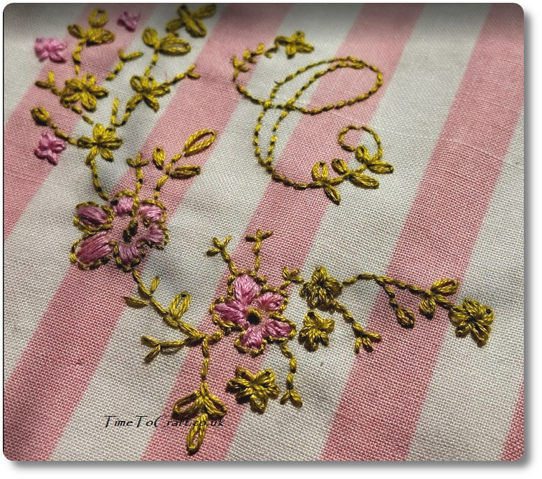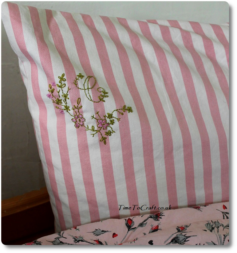 Using a hoop, I embroidered the first initial of my husband’s name on one and mine on the other. I put them on opposite corners, as the embroidered cushions will look better when arranged. They seemed a bit lost on such a big cushion, so I added the flowers to support them and I think it worked.
