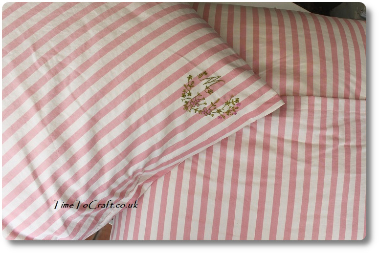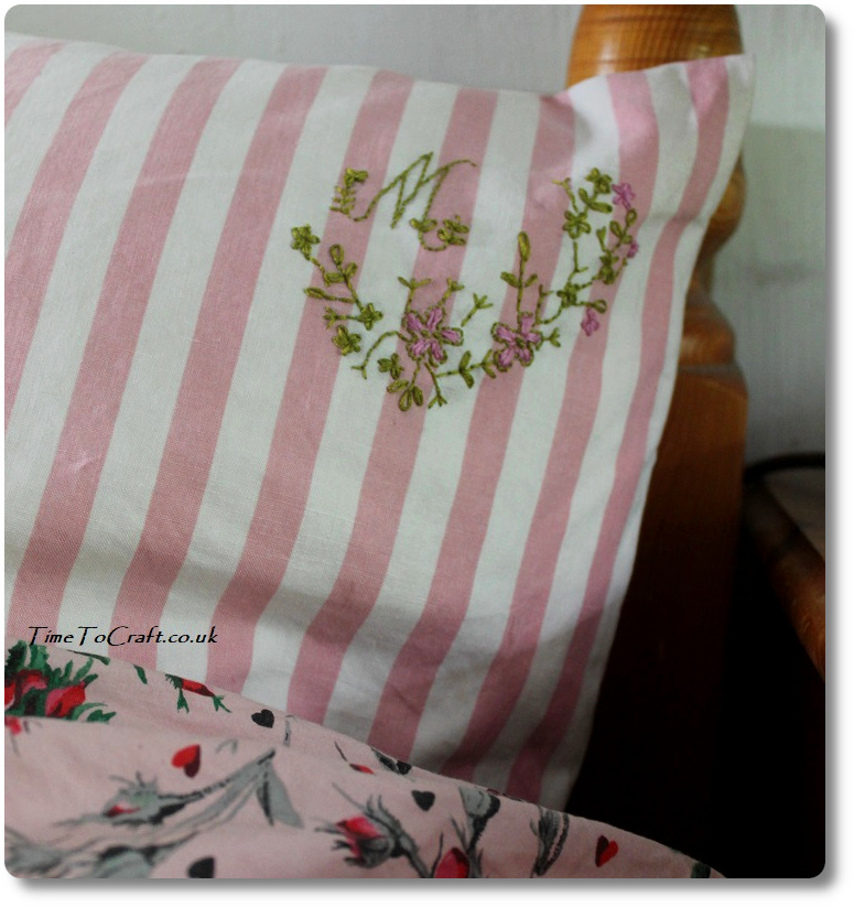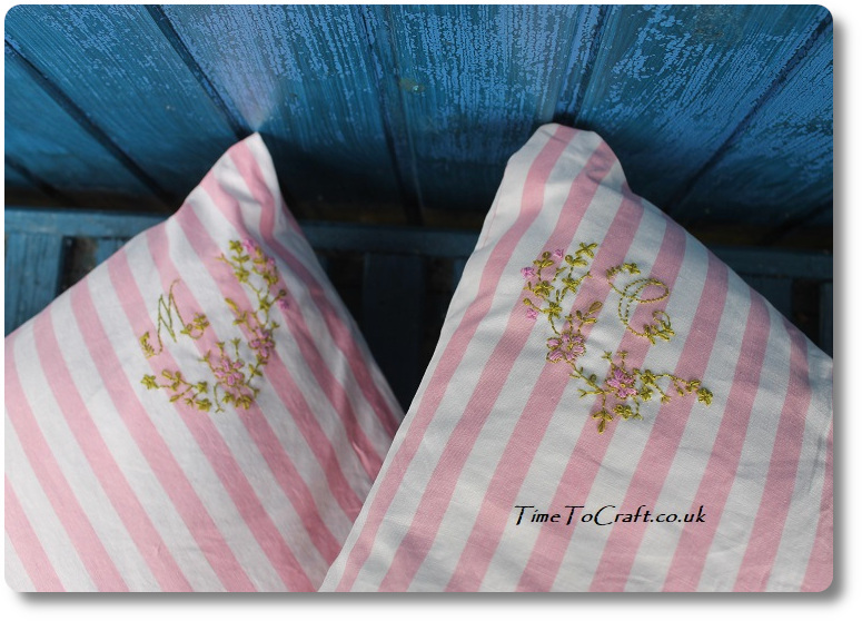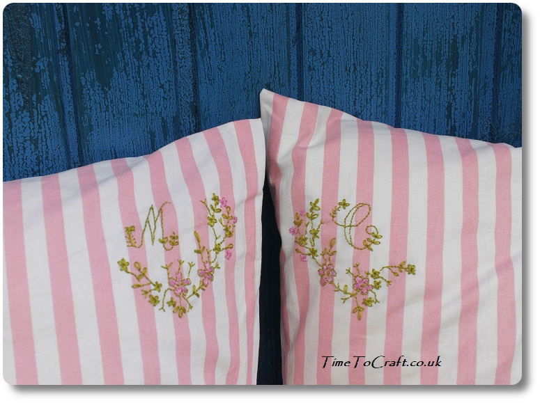 Back in April, we went to a huge flea market and, among other things, I picked up a length of pink and white stripy fabric. It reminded me of the Milly Molly Mandy books and her dress, described as pink and white striped. That’s not why I bought it. Broken threads still highlighted a seam hastily pulled apart. Definitely second hand, not stained and more than ready for a new life, I thought. As soon as I held it, I knew transforming it into embroidered cushions for our bedroom was on the cards. This weekend, I put needle to fabric.