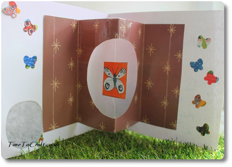 I made another spinning card. A butterfly and nature theme. If you follow me on Instagram, then you might have caught a clip of it spinning as the card is opened. I’ve put it in my Craft tab on my Instagram profile now. All the materials were recycled.