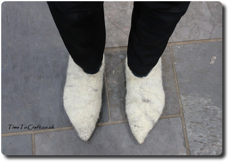 This is the clever part. When they shrink they disguise most imperfections or mistakes you might have made. Even a dropped stitch or a purl instead of a knit. They are truly forgiving. They can even be reshaped, while they’re still damp. Handy if you made one slipper a size too small. So forgiving.