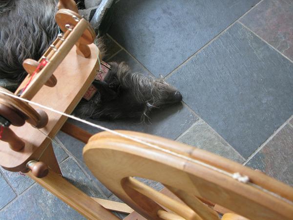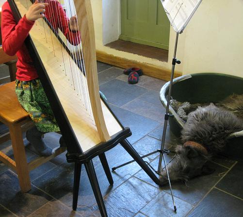 She is amazing. As soon as the harp comes out, she is there. Same with the spinning wheel. I think she loves being in the centre of things. Whatever is going on. Keys, coats or torches get her to her feet as well. Long dogs are amazing companions.