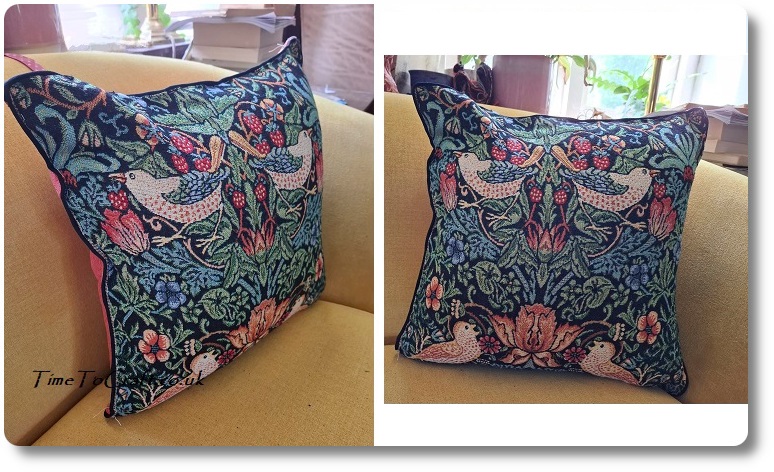While we were out in Glastonbury, I found offcuts of the Strawberry Thieves in upholstery fabric. It’s one of my favourites. I’m turning it into cushions. I used the black piping and an old damask curtain as backing fabric. Almost finished the first one, but couldn’t resist putting the cushion inset in to see how it would look. They are going to be lovely plump cushions