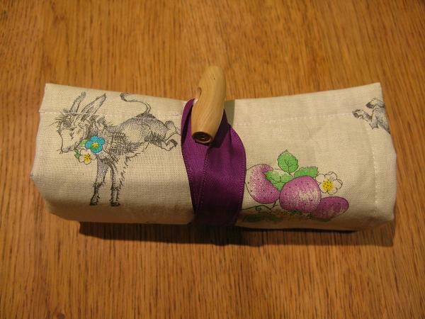 I don’t think two of my crayon/pencil rolls have the same style of fastening. I’ve gone for a toggle again, but this time I’ve doubled the ribbon up to make one big loop. I prefer the finish of this one, so maybe I’ve found my way of doing it.