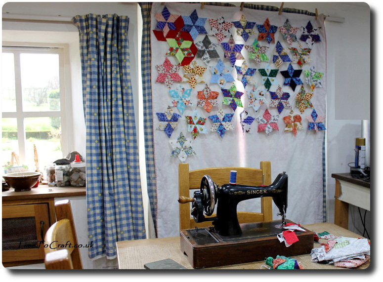 This weekend, I’ve been squeezing in every possible moment to churn out another patchwork star. My sewing room is away from the rest of the house and family, so I used the end of the kitchen table as my makeshift making area. It’s warmer too. My stars are pinned on an old quilt, which I’ve pegged to the back door curtain. Much easier to see how my scrappy quilt is developing.