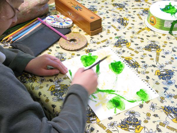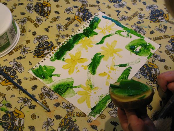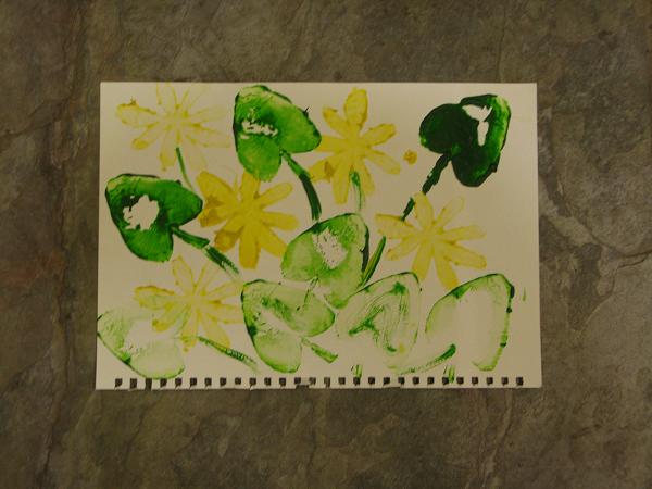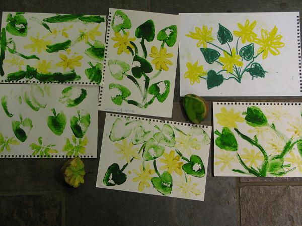 I cut out a potato in the shape of the celandine flower and its heart shape leaves. AJ and TF used these with watercolour paint to print on paper.